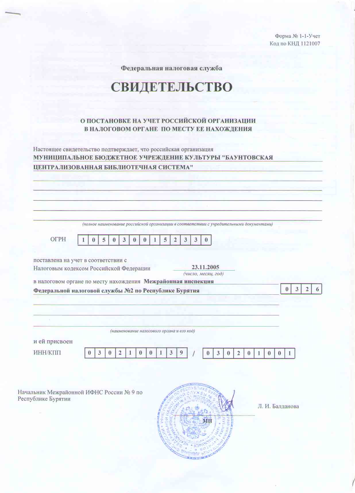 Свидетельство о постановке на учет Российской организации в налоговом органе по месту ее нахождени