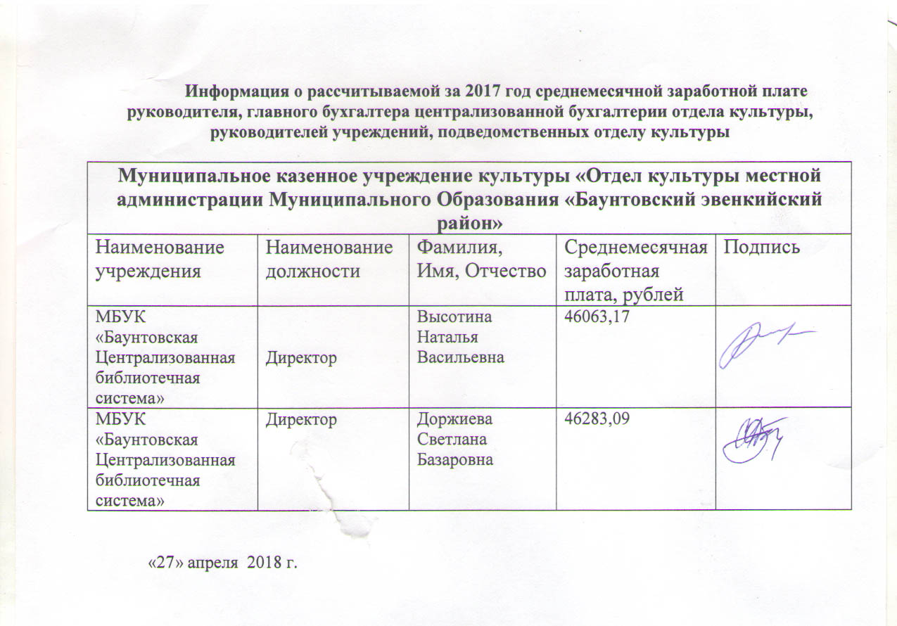 Информация о рассчитыванмой за 2017 год среднемесячной заработной плате руководителя